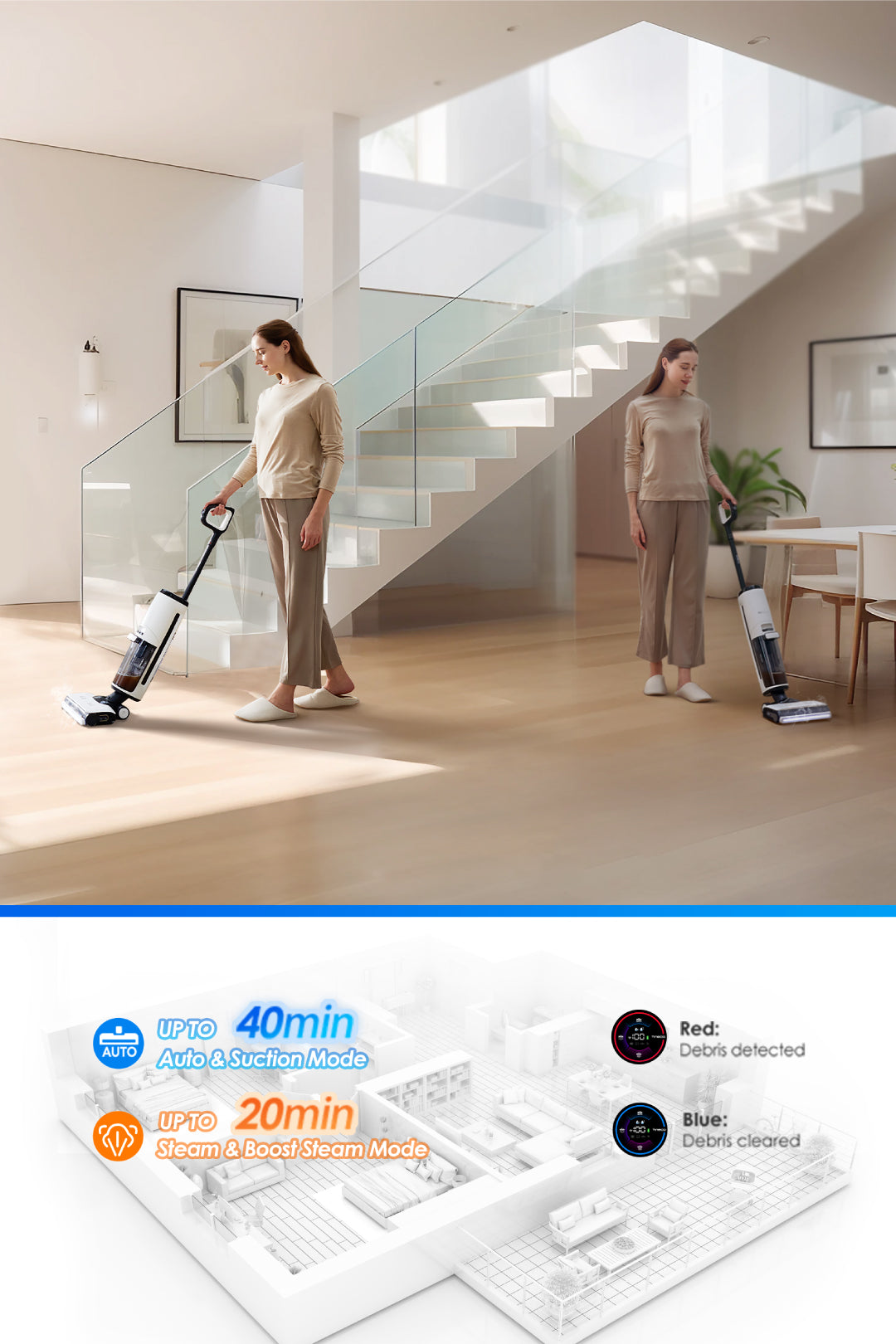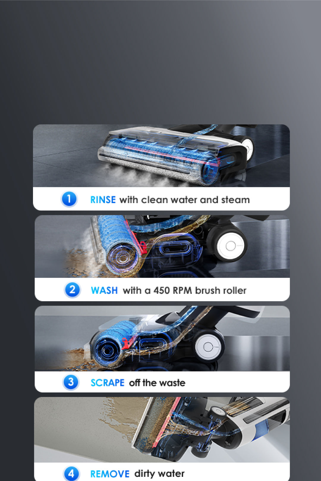 The steam vaccum cleaner can effortlessly tackle tough-to-handle stains, even from outdoors, as the tineco vacuum wet dry automatically detects how dirty the floors are and swiftly cleans, leaving your floors spotless and hygienic. The roller brush is free of dirty water, only when the roller brush is clean, the floors will be clean.
