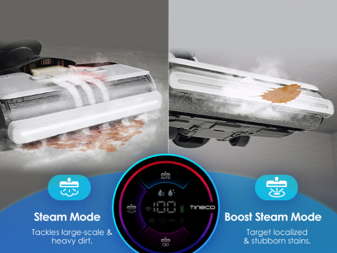 You can select the appropriate cleaning mode of the tineco wet dry vacuum cleaner depending on how dirty the area is. Auto Mode for basic cleaning, Steam Mode for localized stains, Boost Steam Mode for heavy dirt, Suction Mode (only on app) for water suction.